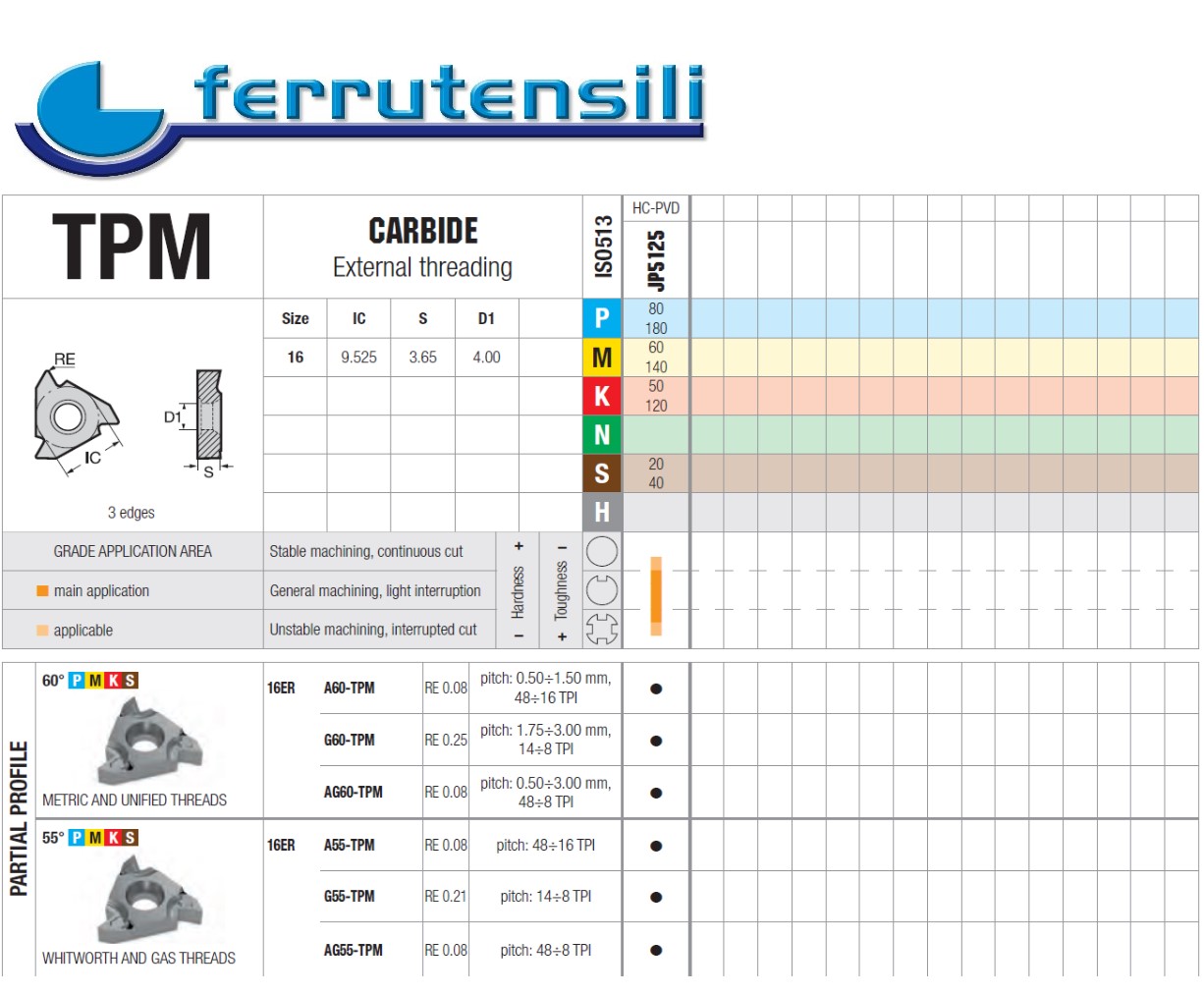 Inserto Filettatura Esterna 60° Profilo Parziale 16ERAG60-TPM JP5125 60° PROFILO PARTZIALE PASSO 0,5÷3 mm. 60° PROFILO PARTZIALE PASSO 48÷8 TPI Qualità HC-PVD UNIVERSALE Nikko Tools® è un marchio di proprietà di Sorma Spa e rappresenta il marchio più giovane, innovativo e dinamico dell'azienda. Nata nel 2006, Nikko è impegnata a fornire al mercato meccanico prodotti di alta qualità ad un prezzo molto competitivo. I prodotti provengono dalle migliori tecnologie giapponesi ed europee e sono studiati per soddisfare un'ampia gamma di esigenze. In una dimensione globale, il potere competitivo di NIKKO e nostro si basa sull'essere una realtà agile collocata in un vasto mercato. Rispetto ai concorrenti, abbiamo una maggiore attenzione ai nostri clienti e lavoriamo costantemente per offrire loro le migliori soluzioni. Pertanto, le parole chiave di Nikko e Ferrutensili sono qualità, prestazioni e versatilità. Qualità eccezionale Lavoriamo con materiali di alta qualità e forniamo un servizio eccellente, perché crediamo che questo sia l'unico modo per funzionare bene. Massime prestazioni Ogni giorno testiamo i nostri prodotti con i clienti in un costante processo di sviluppo, in cui le uniche cose che contano sono fatti, cifre e rapporti. Massima versatilità Approfittiamo della nostra piccolezza, perché ci consente di concentrarci sui dettagli e offrire soluzioni su misura. Perché acquistare NIKKO Portautensili con giusto rapporto qualità prezzo, possibilità di acquistare ricambi originali. Prodotti completi Tornitura Filettature Fresatura Della stessa linea potete acquistare Utensile Filettatura e inserti con guida tecnica e catalogo con dati di taglio scaricabili dal sito www.nikkotools.com Quindi un servizio eccellente ad un prezzo eccellente