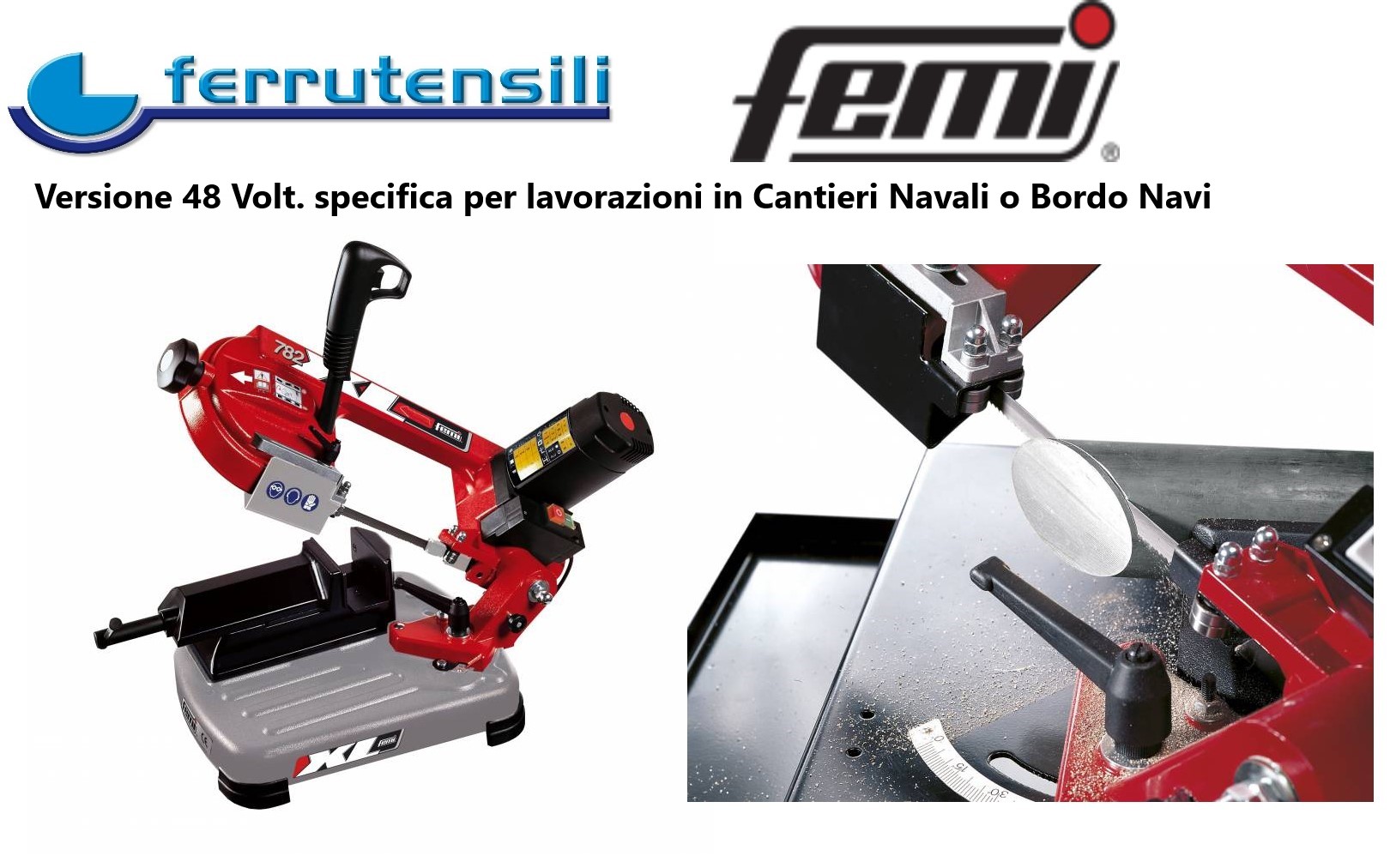 Segatrice a Nastro FEMI 782 XL 48V. codice 8484600 Discesa Braccio Manuale Sviluppo lama mm. 1.335 H mm. 13 spessore mm. 0,65 Potenza Motore watt 560 Alimentazione Volt. 48 Hz 50 Velocità lama mt. min. 70 1 velocità Caratteristiche tecniche: Motore 48 Volt - 560 Watt Tensionatore lama di pratico utilizzo Funzione antiripristino di sicurezza Taglio senza lubrificazione Dispositivo di blocco arco per un facile trasporto Grazie all’alimentazione a 48 Volt è particolarmente adatta all’impiego in: -cantieri navali o a bordo di navi -ambienti sotterranei