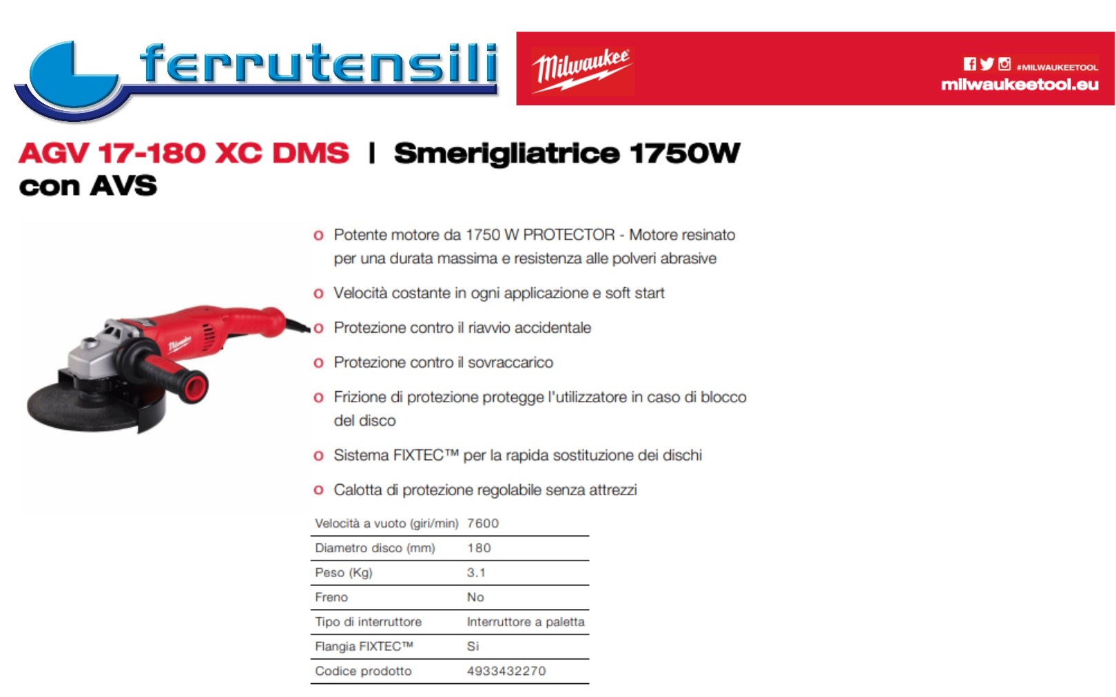 SMERIGLIATRICE MILWAUKEE SGV 17-180 XC DMS COD. 4933432270 Potente motore da 1750 W PROTECTOR - Motore resinato per una durata massima e resistenza alle polveri abrasive Velocità costante in ogni applicazione e soft start Protezione contro il riavvio accidentale Protezione contro il sovraccarico Frizione di protezione protegge l'utilizzatore in caso di blocco del disco Sistema FIXTEC™ per la rapida sostituzione dei dischi Calotta di protezione regolabile senza attrezzi Impugnatura antivibrazione AVS Cavo 4 metri AVS ANTI-VIBRATION SYSTEM SI BLOCCO RIAVVIO ACCIDENTALE SI DIAMETRO DISCO (MM) 180 FILETTATURA ALBERO M14 FRENO NO POTENZA (W) 1750 PROFONDITÀ DI TAGLIO MAX (MM) 58 PROTEZIONE DAL CONTRACCOLPO SI VELOCITÀ A VUOTO (GIRI/MIN) 7600 VELOCITÀ VARIABILE NO PESO (KG) 3.1