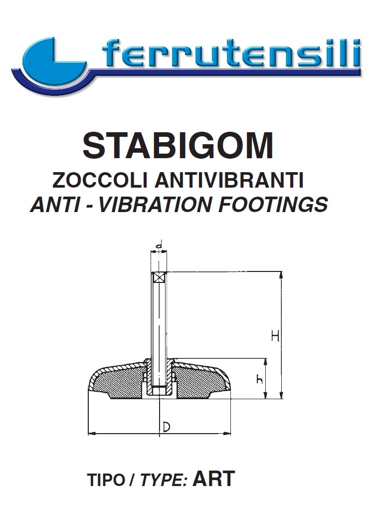 STABIGOM ZOCCOLI ANTIVIBRANTI Materiale: Gambo filettato: estraibile in acciaio zincato, completo di 2 dadi esagonali e 2 rondelle per il livellamento della macchina. Base: in acciaio zincato bianco Suola antivibrante in mescola di gomma ANTIOLIO e ANTISCIVOLO. Durezza gomma : 60° shore A (±5) Uso: Supporti a livellamento rapido di grande portata per macchine utensili, presse, centri di lavoro. Vantaggi: 1) Livellamento della macchina preciso, veloce e semplice. 2) Sensibile smorzamento dei rumori