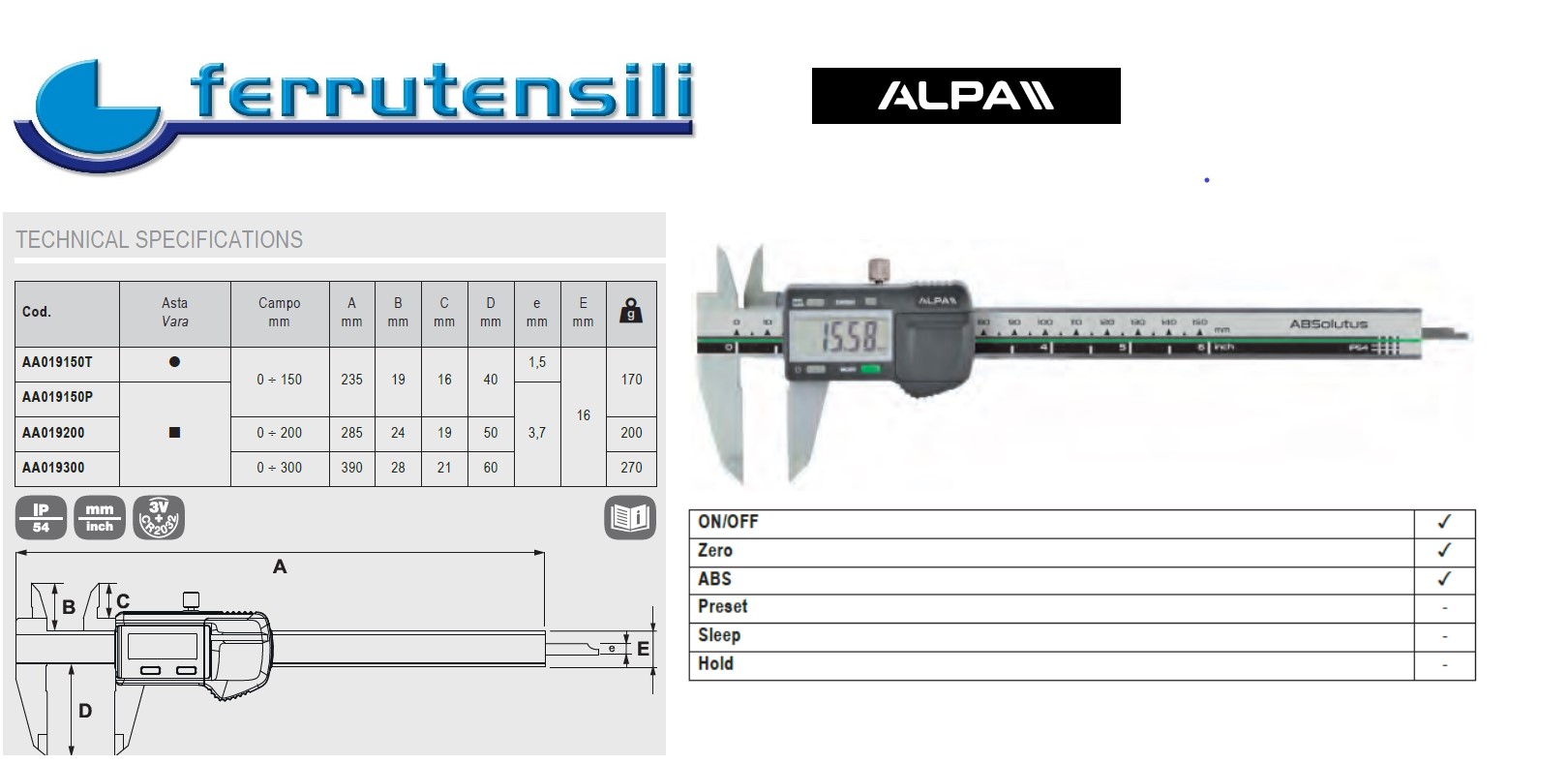 Calibro Digitale IP54 con funzione absolube ALPA Serie AA019 Accuratezza +o-0,02 mm. Risoluzione 0,01 mm. Calibro digitale con elettronica ad alto grado di protezione da polvere e liquidi. Corsoio con vite di bloccaggio. Pulsante di accensione e spegnimento. Misurazioneincrementale e azzeramento in qualsiasi posizione. Funzione di misurazione origine assoluta.