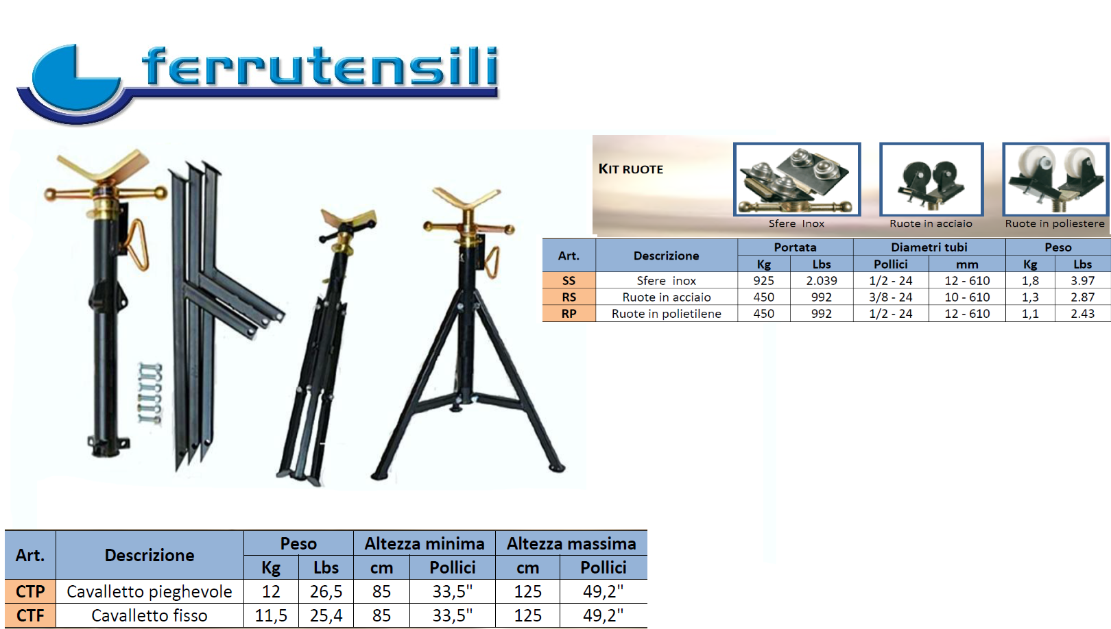 Cavalletti per tubi ED, forniti completi di testa a V, sono disponibili in due versioni: cavalletto fisso e cavalletto pieghevole-richiudibile. Hanno un anello di sicurezza che permette di lavorare in tutta tranquillità evitando improvvise cadute che potrebbero causare danni alle persone. Facili da trasportare e da stoccare a magazzino sono costruiti con materiali robusti e sicuri. A completamento, sono disponibili kit supporto tubi con sfere in inox, ruote in acciaio e in poliestere, tutti intercambiabili tra loro.