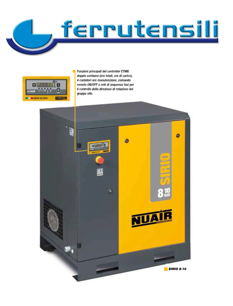 Caratteristiche costruttive e vantaggi: Pressione operativa: 10 bar, con potenze di 7,5 - 11 - 15 kW. Il controller elettronico ETMII gestisce tutte le funzioni del compressore e consente la diagnosi di sistema. Regolatore di aspirazione, blocco separatore e valvola di pressione minima di progettazione e Produzione NUAIR Il sistema di raffreddamento, progettato per funzionare anche nelle condizioni più estreme, garantisce la temperatura operativa ottimale. Filtro olio e filtro separatore, entrambi di tipo spin-on per assicurare elevata efficienza e facile manutenzione. Ventilazione La cabina del compressore è raffreddata dalla ventola assiale comandata direttamente dall’ETMII, per raggiungere rapidamente e mantenere la temperatura di lavoro ottimale.