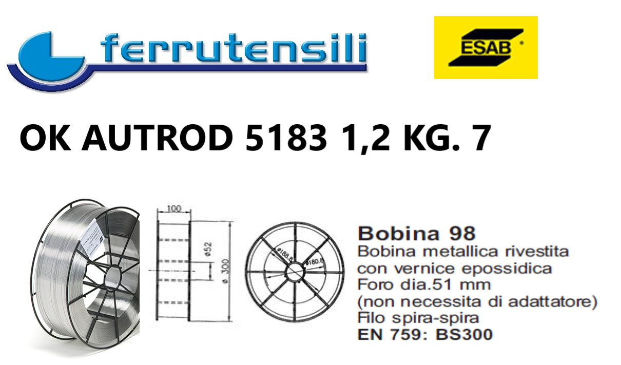 OK Autrod 5183 Filo per saldatura MIG per leghe ad alto contenuto di magnesio. E’ tipicamente utilizzato in applicazioni marine e strutturali in cui sono importanti resistenze elevate, elevata tenacità alla frattura per resistenza agli urti ed esposizione a elementi corrosivi. Classificazioni: SFA/AWS A5.10 : ER5183 EN ISO 18273 : S Al 5183 (AlMg4,5Mn0,7(A)) Approvazioni: CE EN 13479 DNV-GL 5183 RINA WC VdTÜV 04666 Bobina da Kg. 7 in filo metallico rivestita con vernice epossidica NON NECESSITA DI ADATTATORE Filo Spira-Spira A richiesta certificato 3.1