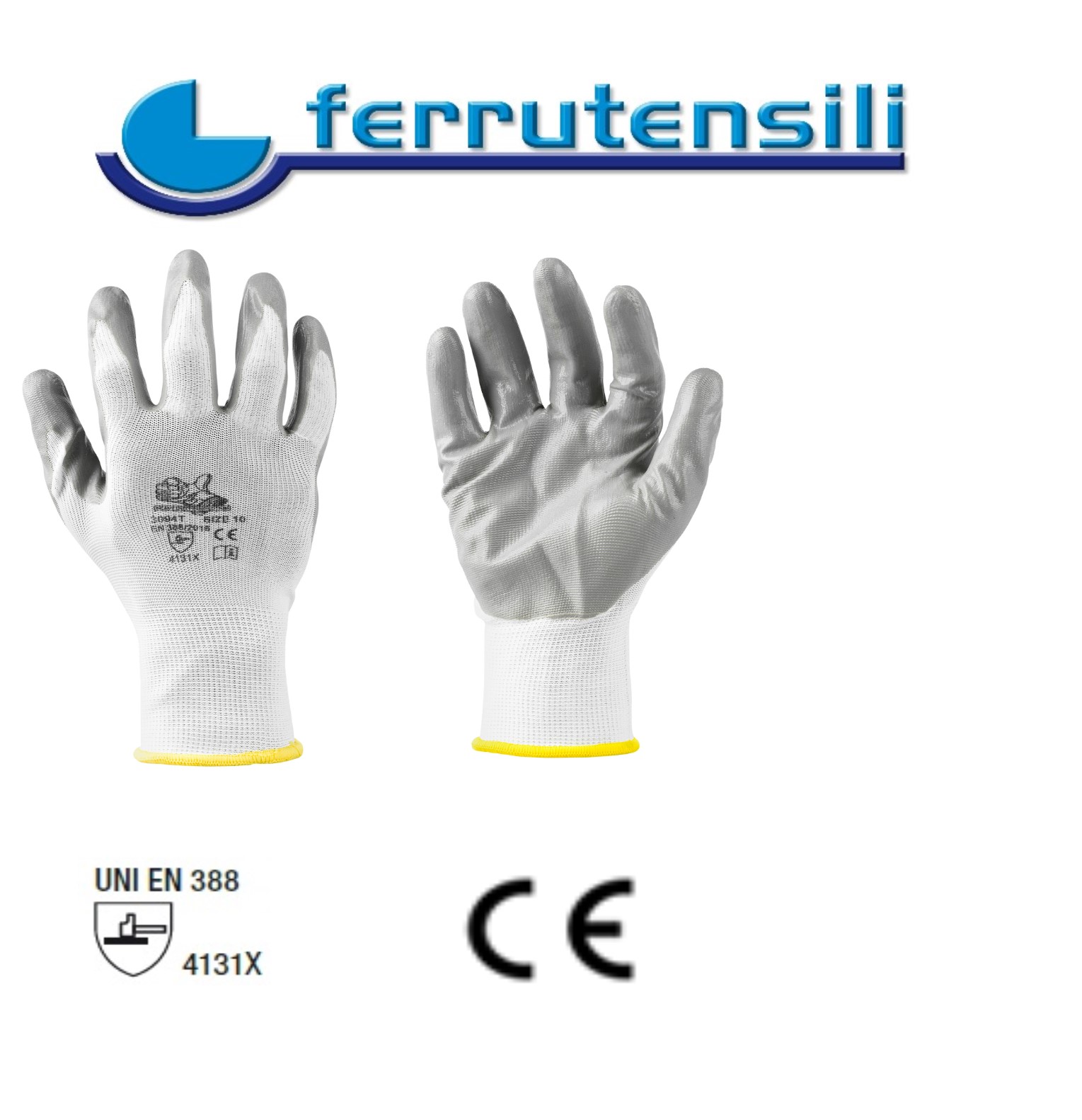 DPI 2a categoria materiale: 100% poliestere spalmato nitrile colore: grigio taglia: - 9 - 10 - imbustati singolarmente con occhiello busta richiudibile
