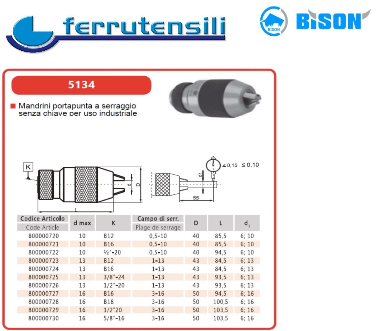Mandrino portapunte Bison Bial Serraggio senza chiave Produzione Europea Codice Articolo 800000727 Tipo 5134-16-B18 EKO Attacco K B18 Campo di serraggio mm. 3-16 Uso: Operazioni di Foratura con macchine Fisse e Portatili Non adatto ad operazioni di Fresatura Maschiatura-Non idoneo per Trapani a percussione Verificare la Disponibilità tramite apposita funzione Verifica Disponibilità In caso di disponibilità 0 per questo articolo la spedizione è prevista in 2/3 gg. lavorativi salvo imprevisti