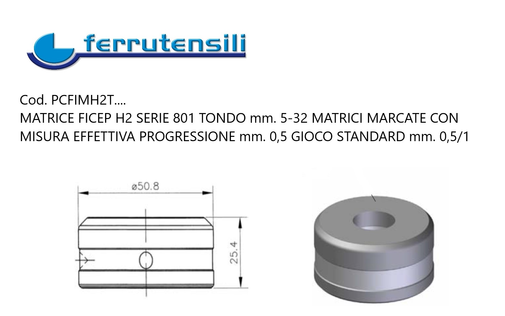 Matrice per Punzonatrice Ficep H2 Serie 801 TONDO Nessun Riferimento Standard dalla misura mm. 5 alla misura mm. 32 Progressione Standard mm. 0,5 Gioco Standard mm. 1 Gioco consigliato acciaio Spessori da 2÷4 mm. Gioco mm. 0,5 Spessori da 4÷8 mm. Gioco mm. 1 Spessori da 8÷12 mm. Gioco mm. 1,5 Spessori da 12÷15 mm. Gioco mm. 2 Le misure delle matrici comprendono il gioco Selezionare la misura tramite il menù a tendina Seleziona un elemento Verificare la Disponibilità tramite apposita funzione Verifica Disponibilità Per le misure NON INDICATE O MANCANTI DI QUOTAZIONE chiedere offerta e termine di consegna Prodotti disponibili in magazzino spedizione in 1 giorno lavorativo max dalla data ordine In caso di disponibilità 0 per questo articolo la spedizione è prevista in 6/7 gg. lavorativi salvo imprevisti