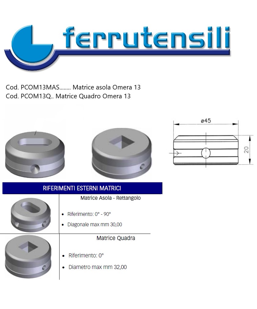 Matrice per Punzonatrice Omera 13 HY Compatibile per macchine idrauliche 40-45-50-70 Compatibile per macchine Meccaniche 13/45 Matrice Asola Lato lungo da mm. 6÷30 progressione mm. 0,5 Lato corto da mm. 3÷24 Riferimento 0°-90° Gioco Standard mm. 0,6 Gioco consigliato acciaio Spessori da 2÷4 mm. Gioco mm. 0,6 Spessori da 5÷8 mm. Gioco mm. 1,1 Spessori da 9÷12 mm. Gioco mm. 1,6 Spessori da 13÷15 mm. Gioco mm. 2,1 Le misure delle matrici comprendono il gioco Selezionare la misura su seleziona un elemento Cliccare su Verifica disponibilità per verificare l'effettiva disponibilità di magazzino Le misure disponibili in magazzino vengono spedite entro le 24 ore lavorative successive all'ordine Le misure non disponibili vengono approntate entro 6 gg. lavorativi data ordine Alre misure a richiesta si possono costruire con tempi di consegna e prezzi da preventivare