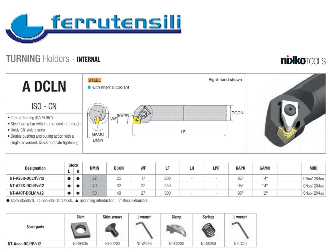 Utensile tornitura INTERNA NIKKO NT-A25R-DCLNR12 Tipo Destro 95° Attacco Tornio TONDO mm. 25 Foro minimo mm. 32 Lunghezza mm. 200 Passaggio lubrificante interno Massima sporgenza 3xD costruito in acciao Inserto tipo CN..1204.. Nikko Tools® è un marchio di proprietà di Sorma Spa e rappresenta il marchio più giovane, innovativo e dinamico dell'azienda. Nata nel 2006, Nikko è impegnata a fornire al mercato meccanico prodotti di alta qualità ad un prezzo molto competitivo. I prodotti provengono dalle migliori tecnologie giapponesi ed europee e sono studiati per soddisfare un'ampia gamma di esigenze. In una dimensione globale, il potere competitivo di NIKKO e nostro si basa sull'essere una realtà agile collocata in un vasto mercato. Rispetto ai concorrenti, abbiamo una maggiore attenzione ai nostri clienti e lavoriamo costantemente per offrire loro le migliori soluzioni. Pertanto, le parole chiave di Nikko e Ferrutensili sono qualità, prestazioni e versatilità. Qualità eccezionale Lavoriamo con materiali di alta qualità e forniamo un servizio eccellente, perché crediamo che questo sia l'unico modo per funzionare bene. Massime prestazioni Ogni giorno testiamo i nostri prodotti con i clienti in un costante processo di sviluppo, in cui le uniche cose che contano sono fatti, cifre e rapporti. Massima versatilità Approfittiamo della nostra piccolezza, perché ci consente di concentrarci sui dettagli e offrire soluzioni su misura. Perché acquistare NIKKO Portautensili con giusto rapporto qualità prezzo, possibilità di acquistare ricambi originali. Prodotti completi Tornitura Filettature Fresatura Della stessa linea potete acquistare Utensile Filettatura e inserti con guida tecnica e catalogo con dati di taglio scaricabili dal sito www.nikkotools.com Quindi un servizio eccellente ad un prezzo eccellente Controllare se disponibile in magazzino tramite apposità funzione Verica Disponibilità Prodotto disponibile in magazino spedizione entro 24 ore dal ricevimento ordine/pagamento. Per prodotti a disponibilità 0 spedizione prevista in 2/3 gg. lavorativi da ricevimento ordine e pagamento