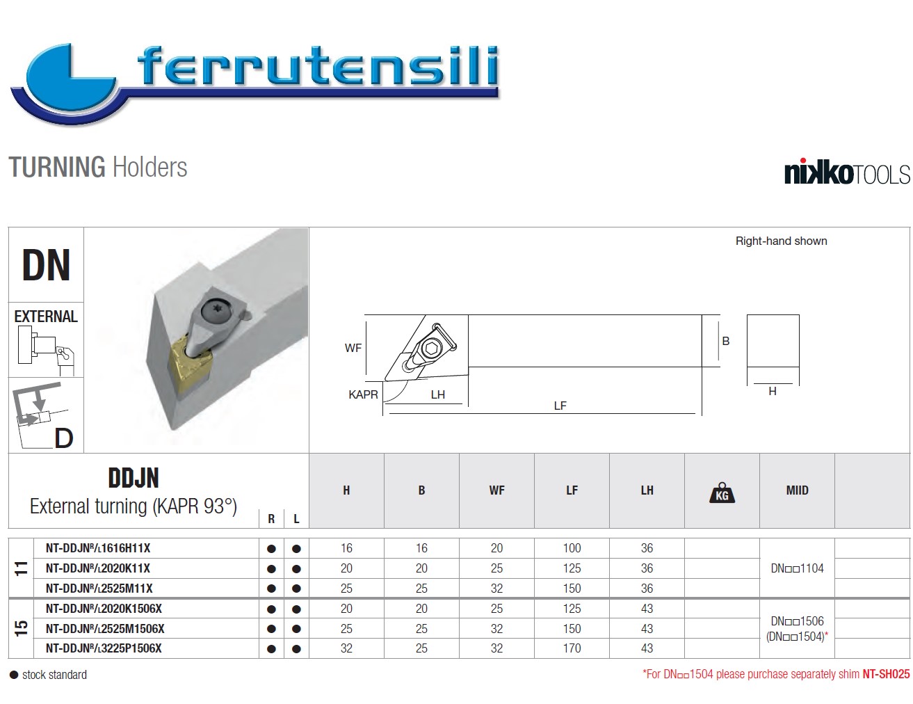Utensile tornitura esterna NIKKO NT-DDJNR2525K1506X Tipo Destro 93° Attacco Tornio quadro mm. 25x25 Lunghezza mm. 150 Inserto tipo DN..1506.. DN..1504 acquistando sottoplacchetta mod. NT-SH025 Nikko Tools® è un marchio di proprietà di Sorma Spa e rappresenta il marchio più giovane, innovativo e dinamico dell'azienda. Nata nel 2006, Nikko è impegnata a fornire al mercato meccanico prodotti di alta qualità ad un prezzo molto competitivo. I prodotti provengono dalle migliori tecnologie giapponesi ed europee e sono studiati per soddisfare un'ampia gamma di esigenze. In una dimensione globale, il potere competitivo di NIKKO e nostro si basa sull'essere una realtà agile collocata in un vasto mercato. Rispetto ai concorrenti, abbiamo una maggiore attenzione ai nostri clienti e lavoriamo costantemente per offrire loro le migliori soluzioni. Pertanto, le parole chiave di Nikko e Ferrutensili sono qualità, prestazioni e versatilità. Qualità eccezionale Lavoriamo con materiali di alta qualità e forniamo un servizio eccellente, perché crediamo che questo sia l'unico modo per funzionare bene. Massime prestazioni Ogni giorno testiamo i nostri prodotti con i clienti in un costante processo di sviluppo, in cui le uniche cose che contano sono fatti, cifre e rapporti. Massima versatilità Approfittiamo della nostra piccolezza, perché ci consente di concentrarci sui dettagli e offrire soluzioni su misura. Perché acquistare NIKKO Portautensili con giusto rapporto qualità prezzo, possibilità di acquistare ricambi originali. Prodotti completi Tornitura Filettature Fresatura Della stessa linea potete acquistare Utensile Filettatura e inserti con guida tecnica e catalogo con dati di taglio scaricabili dal sito www.nikkotools.com Quindi un servizio eccellente ad un prezzo eccellente
