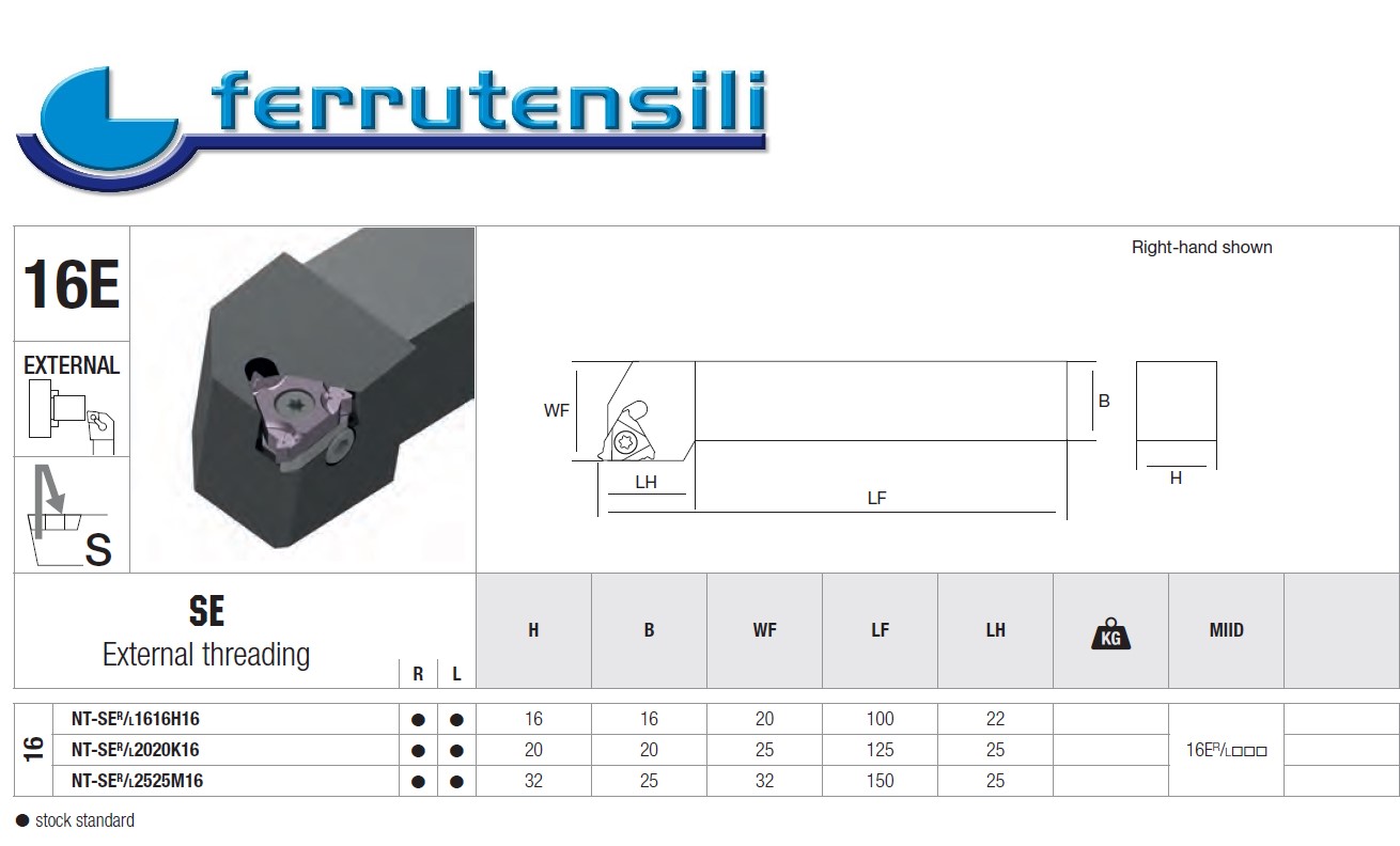 Utensile Filettatura esterna NIKKO NT-SER1616H16 Tipo Destro Attacco Tornio quadro mm. 16x16 Lunghezza mm. 100 Inserto tipo 16 PASSO DA mm. 0,5 A 3 Nikko Tools® è un marchio di proprietà di Sorma Spa e rappresenta il marchio più giovane, innovativo e dinamico dell'azienda. Nata nel 2006, Nikko è impegnata a fornire al mercato meccanico prodotti di alta qualità ad un prezzo molto competitivo. I prodotti provengono dalle migliori tecnologie giapponesi ed europee e sono studiati per soddisfare un'ampia gamma di esigenze. In una dimensione globale, il potere competitivo di NIKKO e nostro si basa sull'essere una realtà agile collocata in un vasto mercato. Rispetto ai concorrenti, abbiamo una maggiore attenzione ai nostri clienti e lavoriamo costantemente per offrire loro le migliori soluzioni. Pertanto, le parole chiave di Nikko e Ferrutensili sono qualità, prestazioni e versatilità. Qualità eccezionale Lavoriamo con materiali di alta qualità e forniamo un servizio eccellente, perché crediamo che questo sia l'unico modo per funzionare bene. Massime prestazioni Ogni giorno testiamo i nostri prodotti con i clienti in un costante processo di sviluppo, in cui le uniche cose che contano sono fatti, cifre e rapporti. Massima versatilità Approfittiamo della nostra piccolezza, perché ci consente di concentrarci sui dettagli e offrire soluzioni su misura. Perché acquistare NIKKO Portautensili con giusto rapporto qualità prezzo, possibilità di acquistare ricambi originali. Prodotti completi Tornitura Filettature Fresatura Della stessa linea potete acquistare Utensile Filettatura e inserti con guida tecnica e catalogo con dati di taglio scaricabili dal sito www.nikkotools.com Quindi un servizio eccellente ad un prezzo eccellente