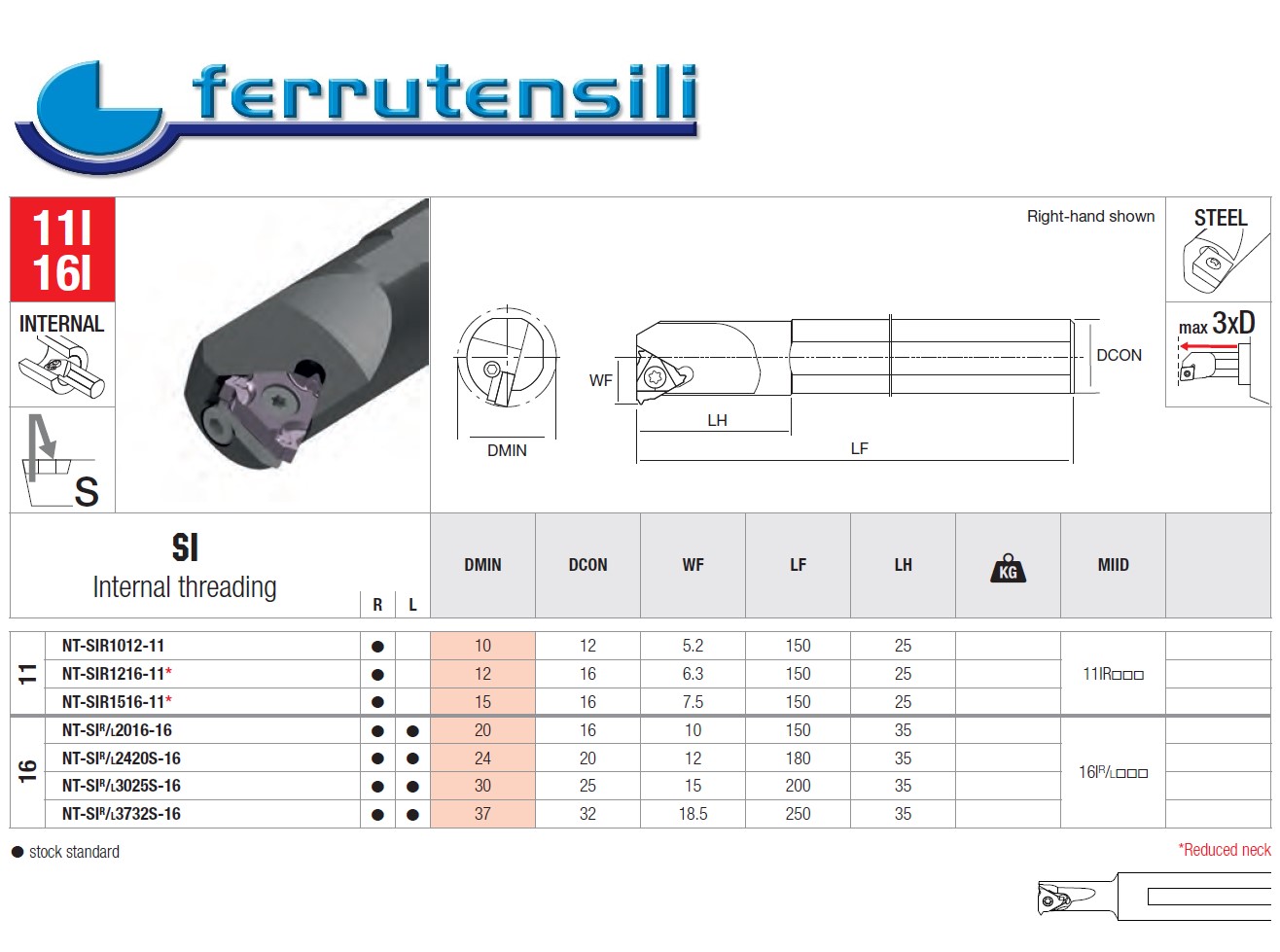 Utensile Filettatura INTERNA NIKKO NT-SIR3732S-16 Tipo Destro Attacco Tornio tondo mm. 32 FORO MINIMO mm. 37 Lunghezza mm. 250 Inserto tipo 16 PASSO DA mm. 0,5 A MM. 3 Nikko Tools® è un marchio di proprietà di Sorma Spa e rappresenta il marchio più giovane, innovativo e dinamico dell'azienda. Nata nel 2006, Nikko è impegnata a fornire al mercato meccanico prodotti di alta qualità ad un prezzo molto competitivo. I prodotti provengono dalle migliori tecnologie giapponesi ed europee e sono studiati per soddisfare un'ampia gamma di esigenze. In una dimensione globale, il potere competitivo di NIKKO e nostro si basa sull'essere una realtà agile collocata in un vasto mercato. Rispetto ai concorrenti, abbiamo una maggiore attenzione ai nostri clienti e lavoriamo costantemente per offrire loro le migliori soluzioni. Pertanto, le parole chiave di Nikko e Ferrutensili sono qualità, prestazioni e versatilità. Qualità eccezionale Lavoriamo con materiali di alta qualità e forniamo un servizio eccellente, perché crediamo che questo sia l'unico modo per funzionare bene. Massime prestazioni Ogni giorno testiamo i nostri prodotti con i clienti in un costante processo di sviluppo, in cui le uniche cose che contano sono fatti, cifre e rapporti. Massima versatilità Approfittiamo della nostra piccolezza, perché ci consente di concentrarci sui dettagli e offrire soluzioni su misura. Perché acquistare NIKKO Portautensili con giusto rapporto qualità prezzo, possibilità di acquistare ricambi originali. Prodotti completi Tornitura Filettature Fresatura Della stessa linea potete acquistare Utensile Filettatura e inserti con guida tecnica e catalogo con dati di taglio scaricabili dal sito www.nikkotools.com Quindi un servizio eccellente ad un prezzo eccellente