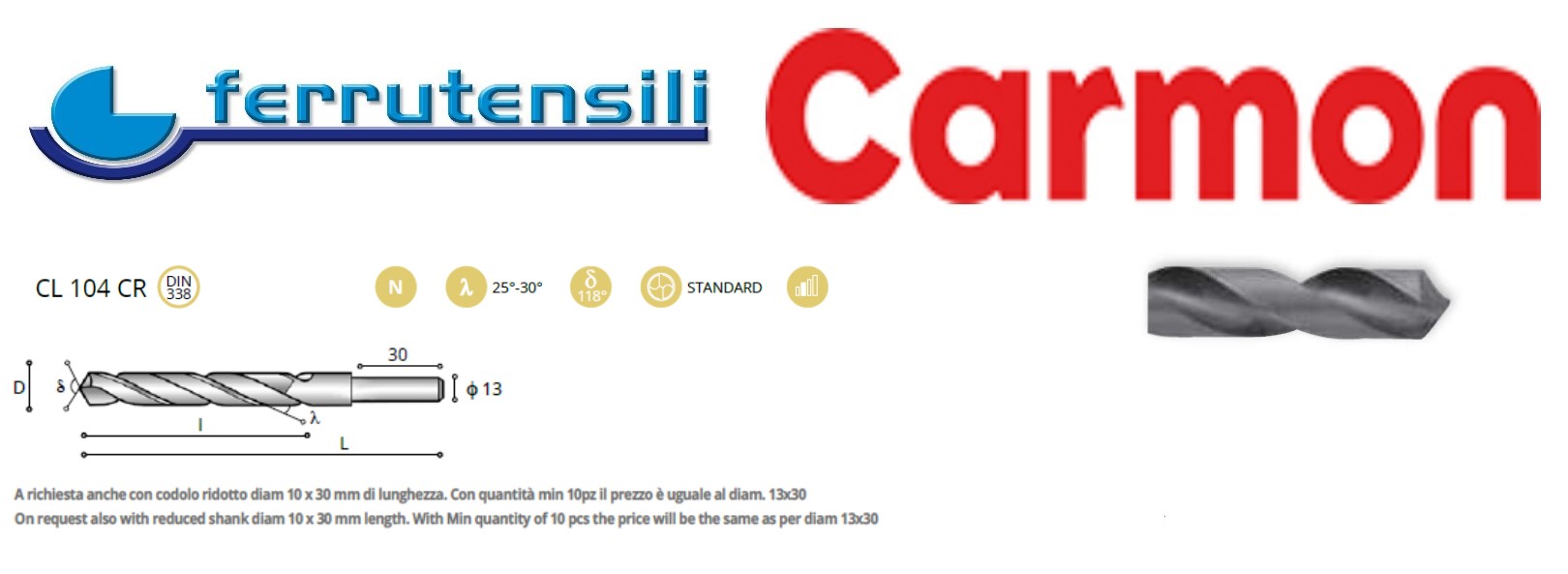 Punta HSS NERA Carmon Modello CL104 CR Rettificata Disponibile dalla misura mm. 13,5 alla misura 20,00 progressione mm. 0,5 118° Affilatura Standard Codolo ridotto mm. 13x30. A richiesta possono essere fornite con diametro codolo mm. 10x30 il prezzo non cambia (consegna 10 gg. lavorativi, quantitativo minimo 10 Pz. per misura) Ideale per Acciai medio legati Per trapani a mano e a colonna Scegliere la misura tramite menu a tendina selezziona un elemento Verificare la Disponibilità tramite apposita funzione Verifica Disponibilità Per misure speciali e diametri non disponibili o senza prezzo visibile, richiedere offerta In caso di disponibilità 0 per questo articolo la spedizione è prevista in 2/3 gg. lavorativi salvo imprevisti
