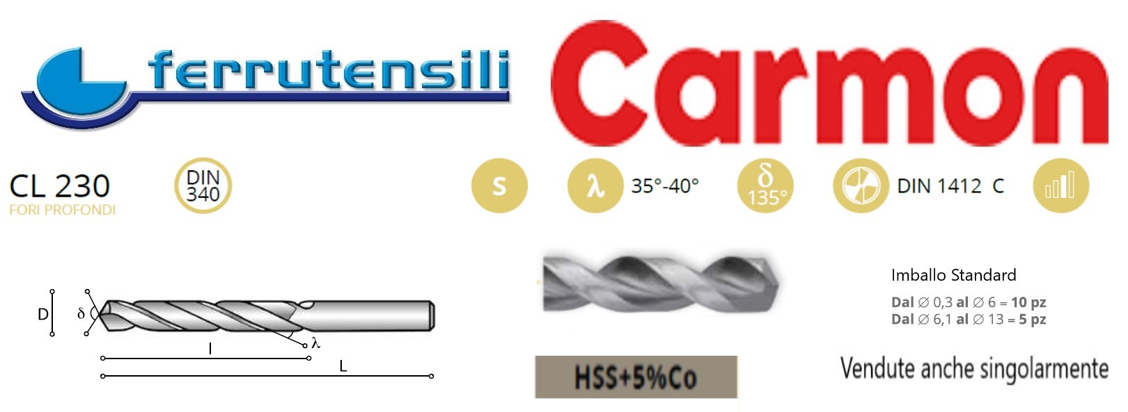 Punta HSS 5% Co Carmon Modello CL230 FORI PROFONDI DIN340 Profondità di Foratura consigliata x una buona evacuazione del truciolo = I-1,5x diametro punta Rettificata Disponibile dalla misura mm. 2 alla misura 13,00 135° Affilatura din1412 C Ideale per Acciai Alto Legati INOX Per trapani a colonna Fresatrici Torni Scegliere la misura tramite menu a tendina selezziona un elemento Verificare la Disponibilità tramite apposita funzione Verifica Disponibilità Per misure speciali e diametri non disponibili o senza prezzo visibile, richiedere offerta In caso di disponibilità 0 per questo articolo la spedizione è prevista in 2/3 gg. lavorativi salvo imprevisti