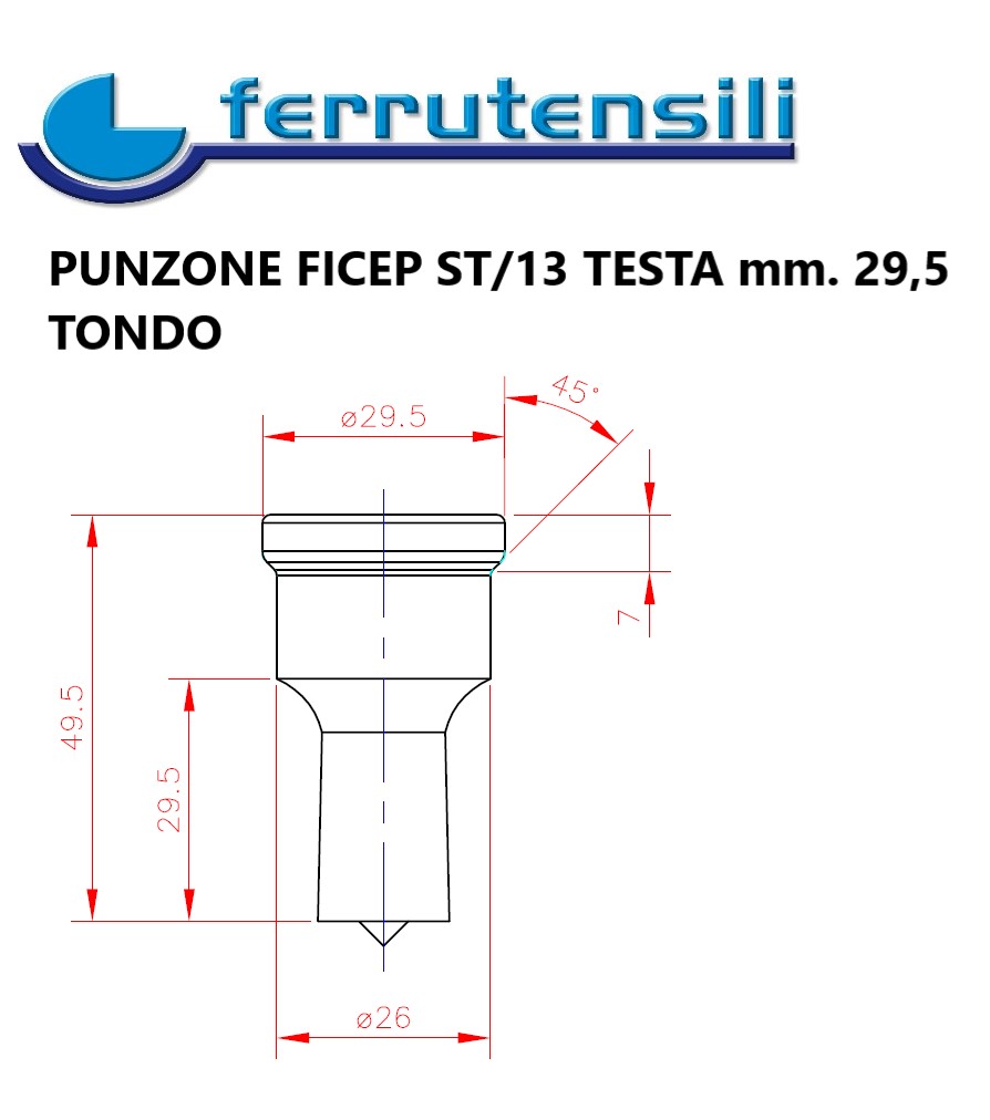 Punzone per Punzonatrice Ficep ST/13 Testa mm. 29,5 Punzone Tondo da mm. 5÷14 progressione mm. 0,5 con sovraprezzo misura speciale Punzone Tondo da mm.14,5÷26 progressione mm. 0,5 Verificare la Disponibilità tramite apposita funzione Verifica Disponibilità Per le misure senza prezzo chiedere offerta e termine di consegna Prodotti disponibili in magazzino spedizione in 1 giorno lavorativo max dalla data ordine In caso di disponibilità 0 per questo articolo la spedizione è prevista in 6/7 gg. lavorativi salvo imprevisti