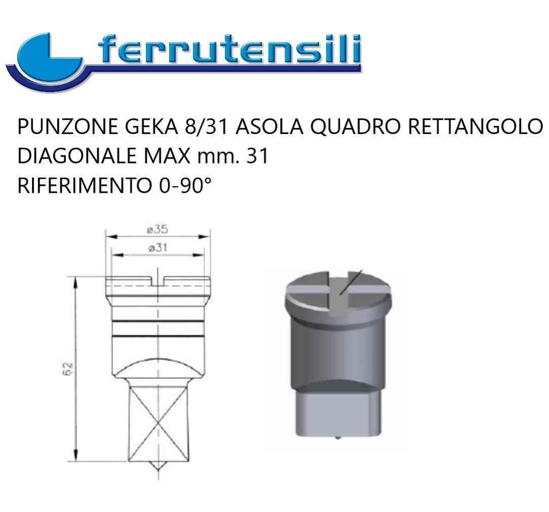 Punzone per Punzonatrice GEKA SERIE 8/31 Punzone QUADRO da mm. 5 progressione mm. 0,5 A DIAGONALE MAX mm. 31 Punzone inferiore a mm. 5 disponibili a richiesta con sovraprezzo Riferimento tipo a croce sulla testa 0°-90° Selezionare misura nel menù a tendina su seleziona un elemento Qualora la misura sia sprovvista di prezzo si prega richiedere offerta Verificare la Disponibilità tramite apposita funzione Verifica Disponibilità In caso di disponibilità 0 per questo articolo la spedizione è prevista in 6/10 gg. lavorativi salvo imprevisti