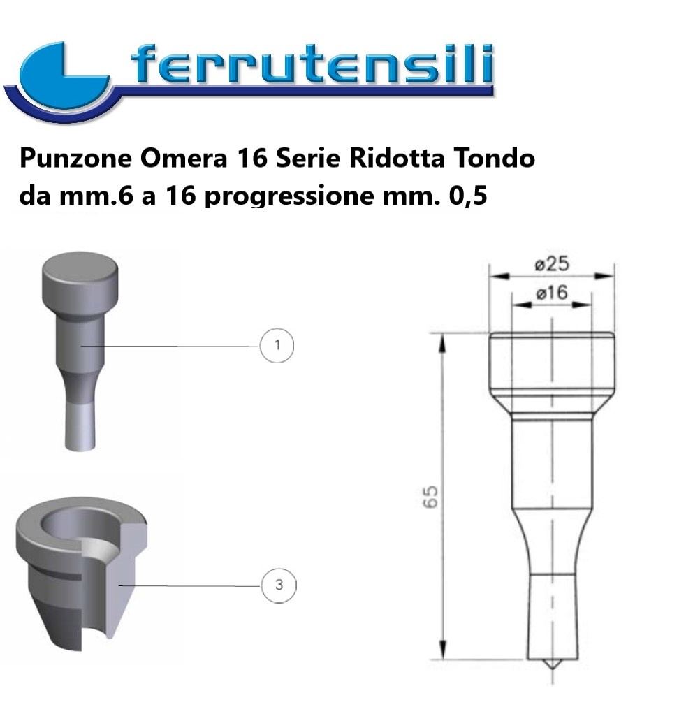 Punzone per Punzonatrice OMERA 16 -70HY 90HY 120HY Da Utilizzare con riduzione Adattatore Punzone ridotto Omera Serie 16 particolare in foto 3 Punzone Tondo da Ridotto da mm. 6÷19 progressione mm. 0,5 Punzone Tondo inferiore a mm. 6 disponibili con sovraprezzo Selezionare misura nel menù a tendina su seleziona un elemento Qualora la misura sia sprovvista di prezzo si prega richiedere offerta Verificare la Disponibilità tramite apposita funzione Verifica Disponibilità In caso di disponibilità 0 per questo articolo la spedizione è prevista in 6/10 gg. lavorativi salvo imprevisti