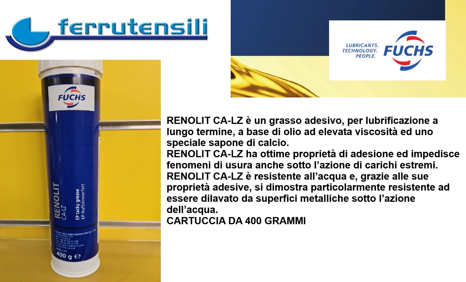 RENOLIT CA-LZ è un grasso adesivo, per lubrificazione a lungo termine, a base di olio ad elevata viscosità ed uno speciale sapone di calcio. Ottime proprietà di adesione ed impedisce fenomeni di usura anche sotto l’azione di carichi estremi. Resistente all’acqua Confezione Cartuccia Kg. 0,4 Verificare la Disponibilità tramite apposita funzione Verifica Disponibilità Per prodotto con disponibilità spedizione in 1 gg. lavorativo data ordine/pagamento In caso di disponibilità 0 per questo articolo la spedizione è prevista in 4/5 settimane lavorative salvo imprevisti Sceda di Sicurezza disponibile a richiesta