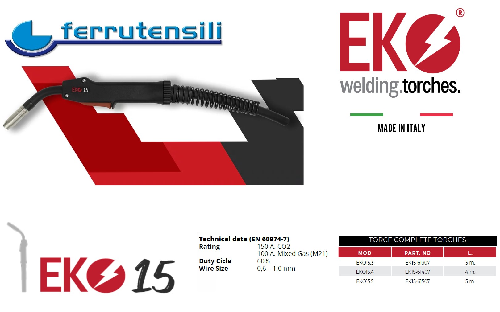 Torcia per Saldatura MIG progettata e prodotta interamente in Italia da DELFO Altissima qualità Montata in Italia Lancia di produzione Italiana Cavo di produzione Europea Impugnatura Ergonomica EKO15 Torcia di gran qualità leggera e funzionale