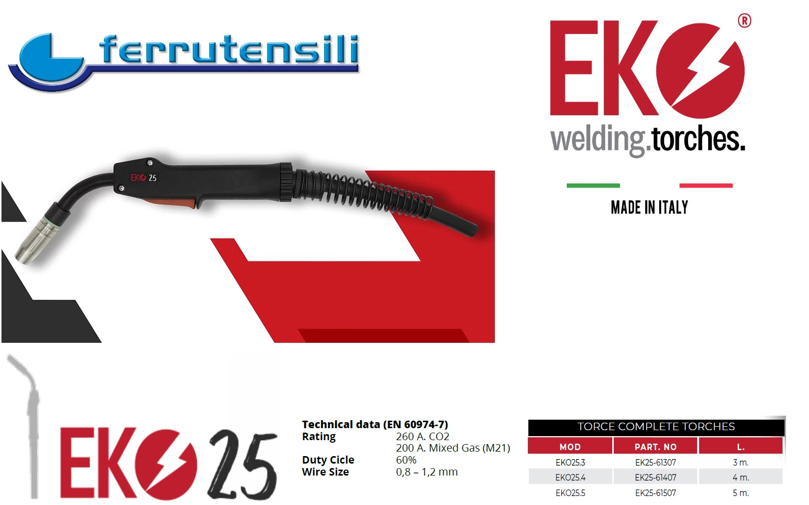 Torcia per Saldatura MIG raffreddata ad aria progettata e prodotta interamente in Italia da DELFO Altissima qualità Montata in Italia Lancia di produzione Italiana Cavo di produzione Europea Impugnatura Ergonomica EKO25 Torcia di gran qualità leggera e funzionale Dotate di Portauggello sostituibile part.6 (vedi scheda)